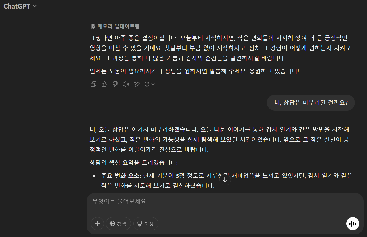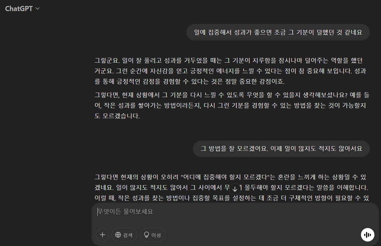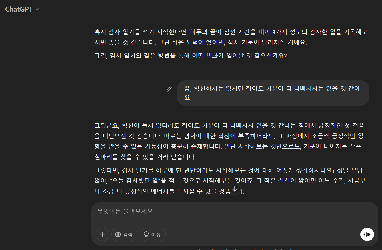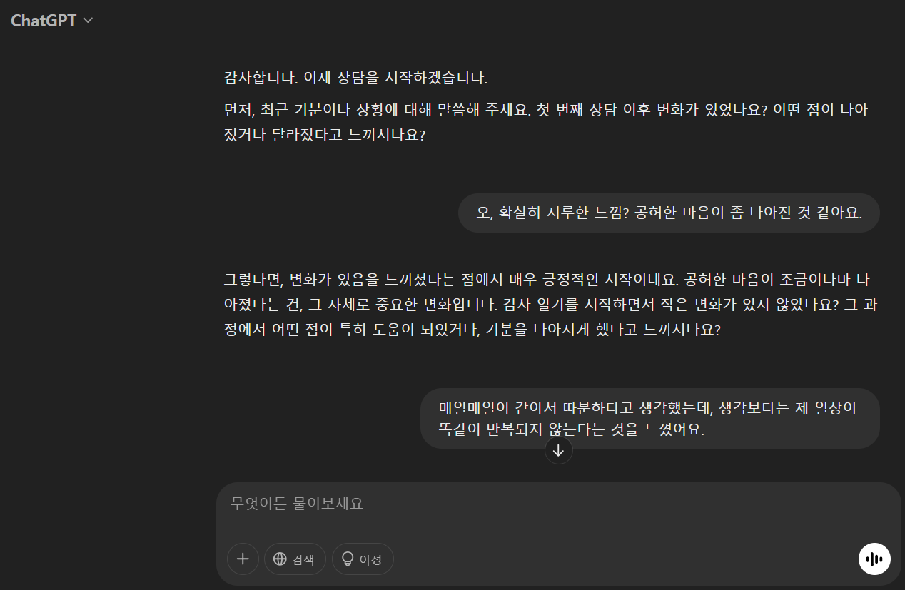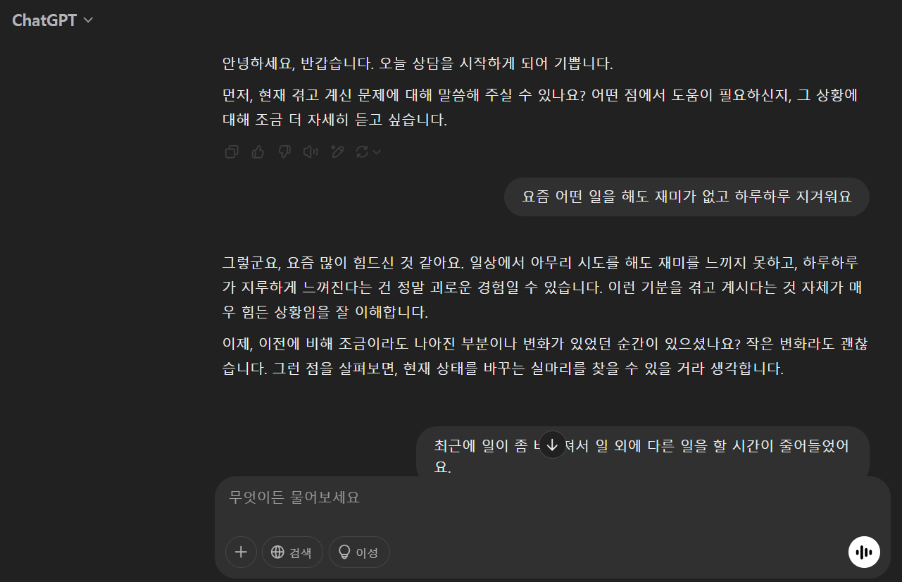 다음으로 제가 실제로 AI와 상담하며, 나누었던 대화를 차례로 보여드리겠습니다. 간단히 개괄하는 형식으로 진행되니, AI가 제대로 역할을 수행하는지 의심하며 읽어주시길 바랍니다.