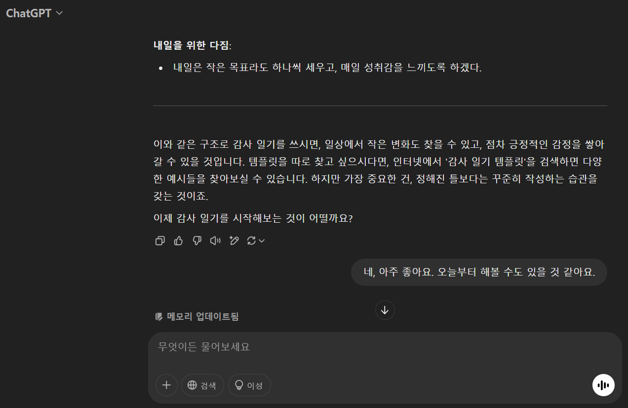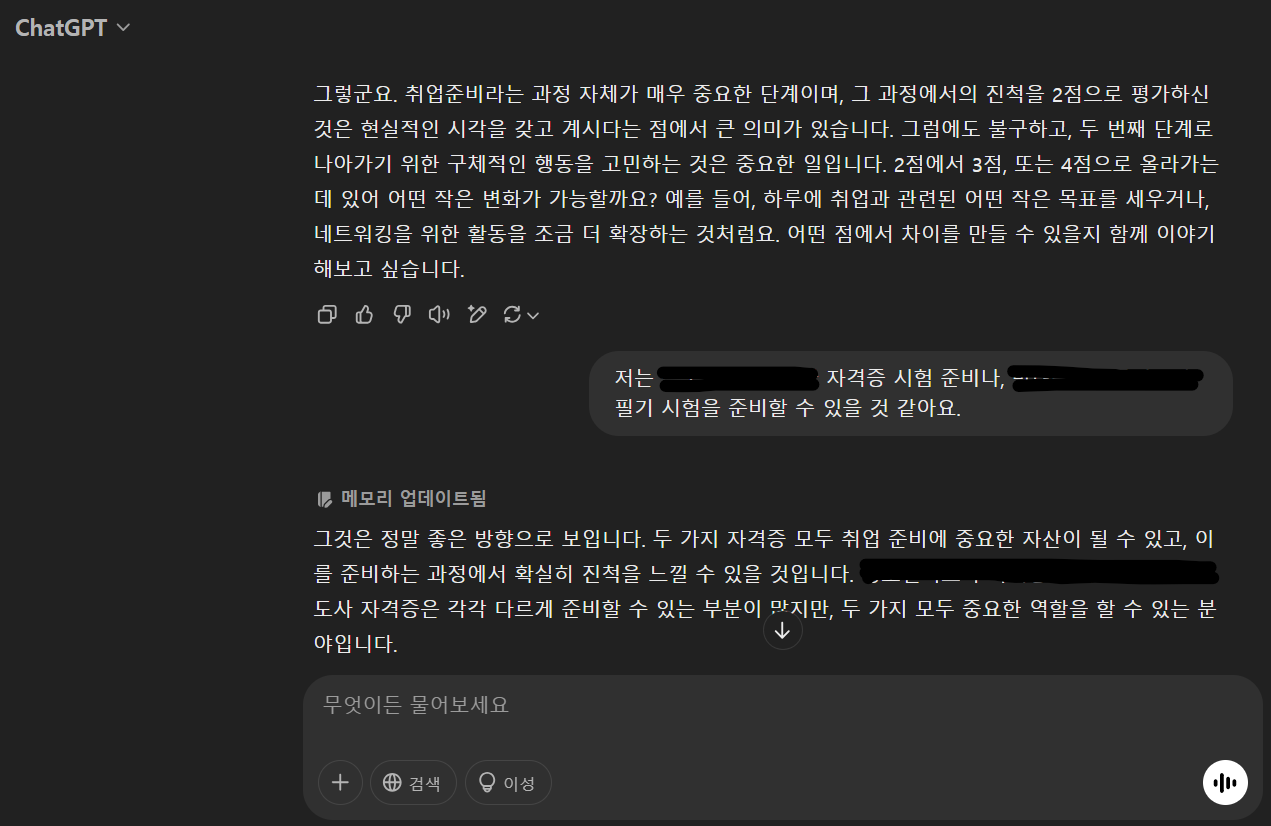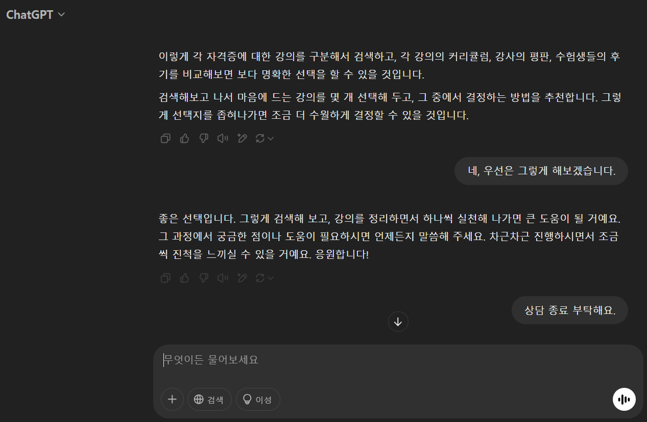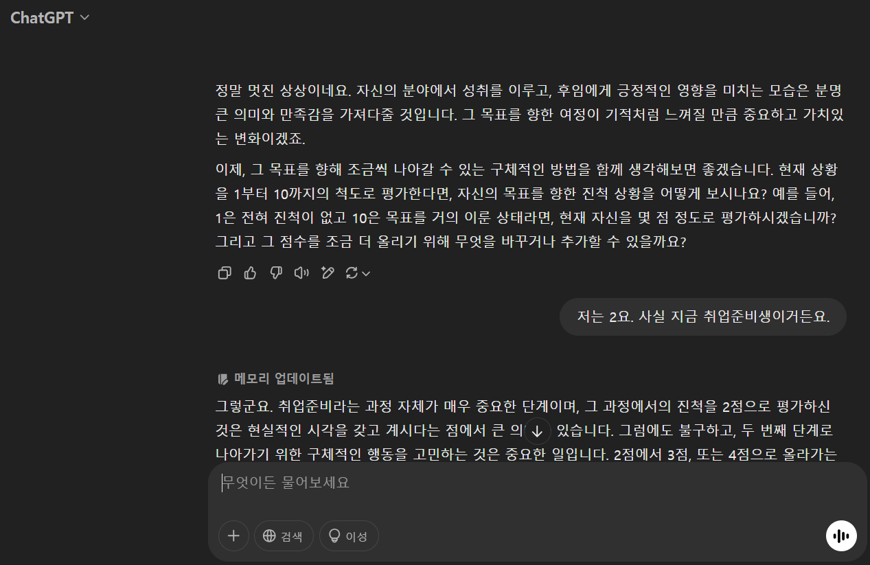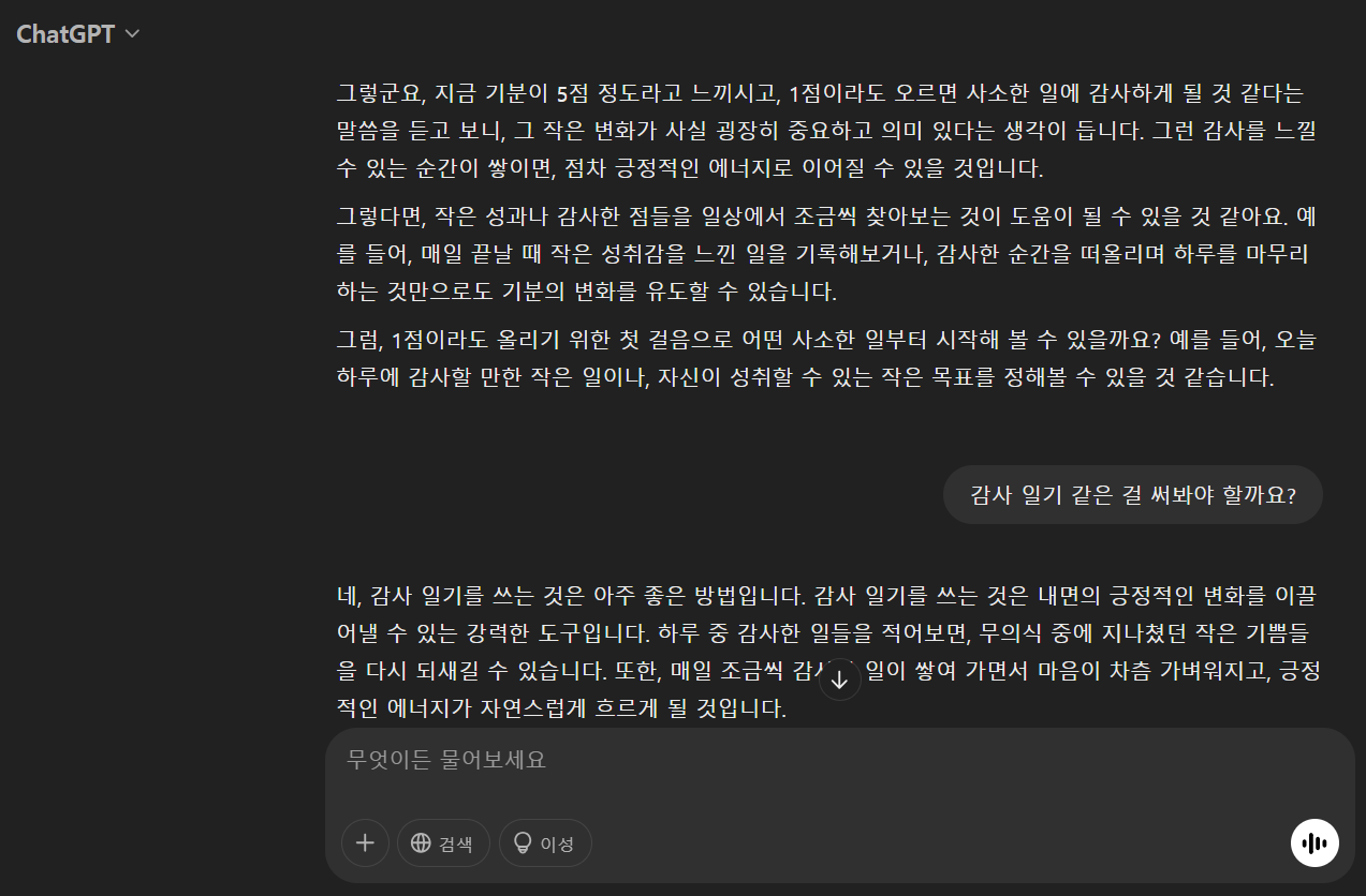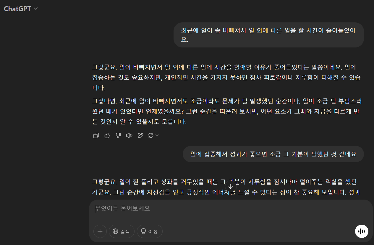 다음으로 제가 실제로 AI와 상담하며, 나누었던 대화를 차례로 보여드리겠습니다. 간단히 개괄하는 형식으로 진행되니, AI가 제대로 역할을 수행하는지 의심하며 읽어주시길 바랍니다.