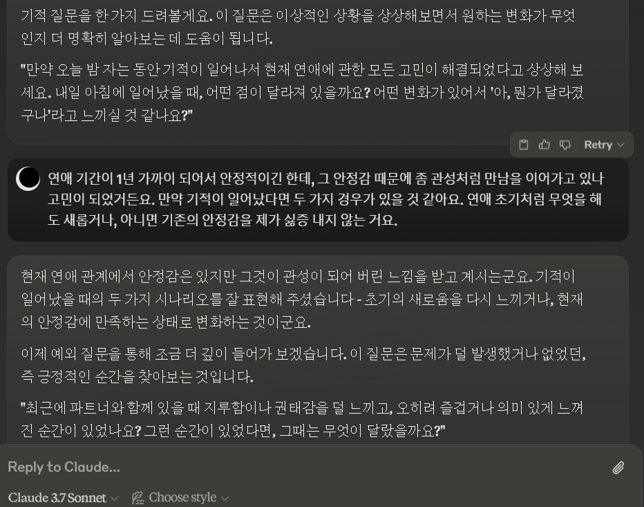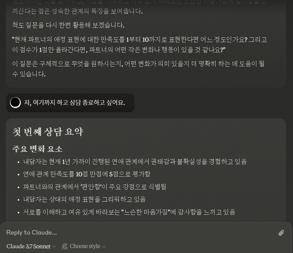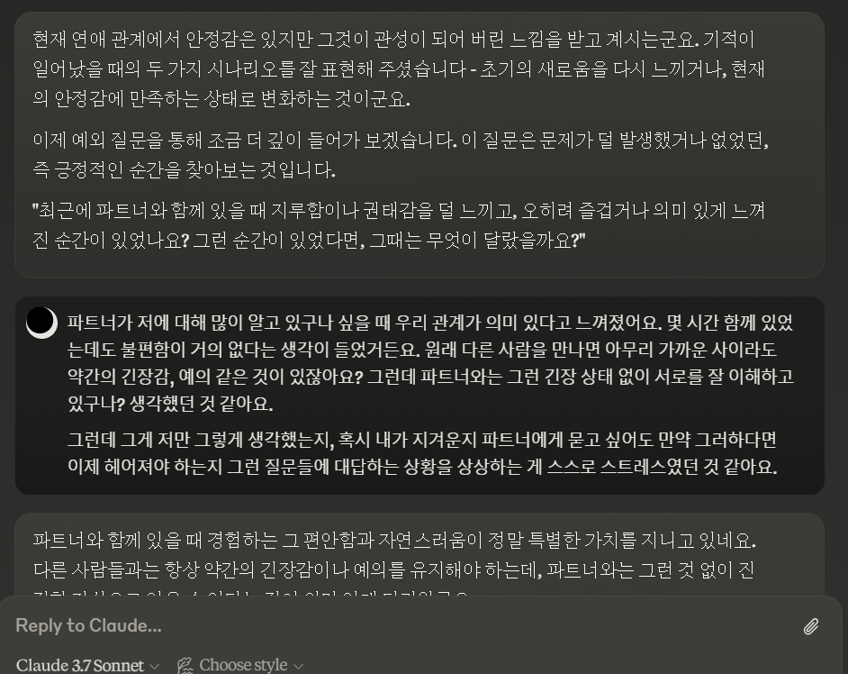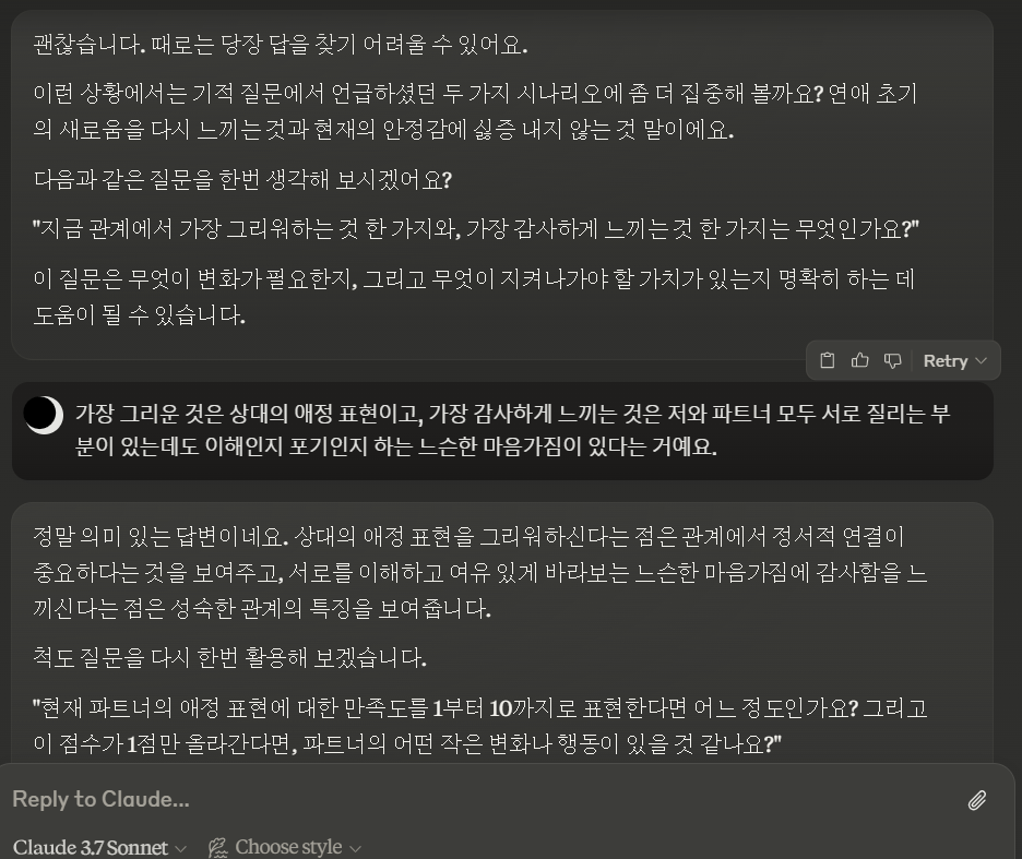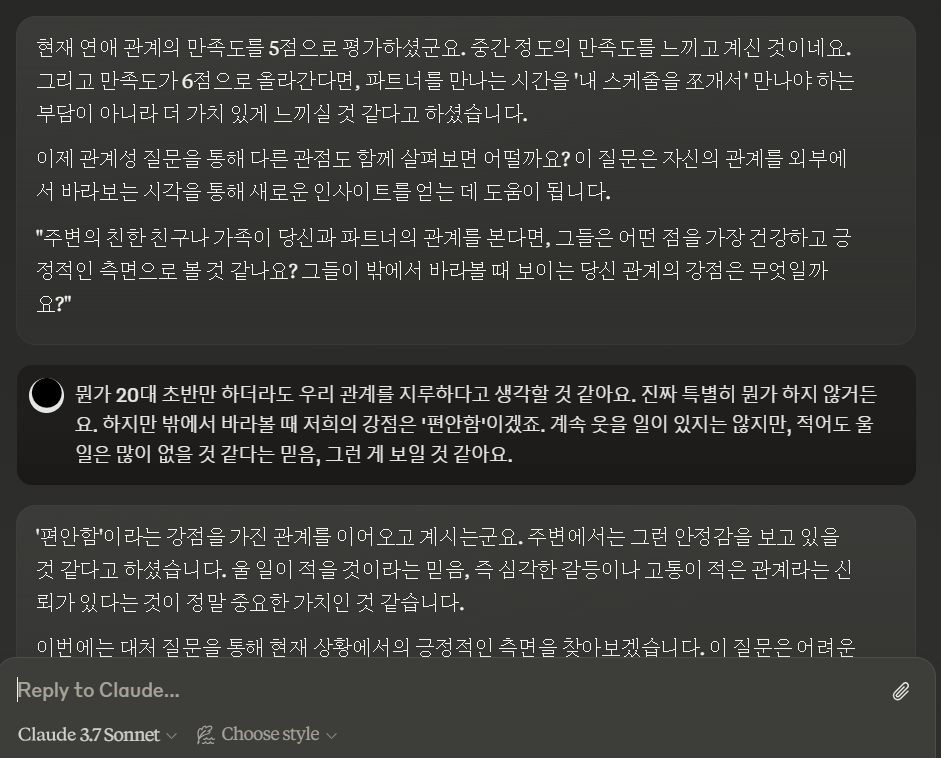 자, 이제 연애 상담을 AI에게 부탁해 보겠습니다. 이번에는 ChatGPT 대신 Claude에게 상담을 요청해 봤습니다.