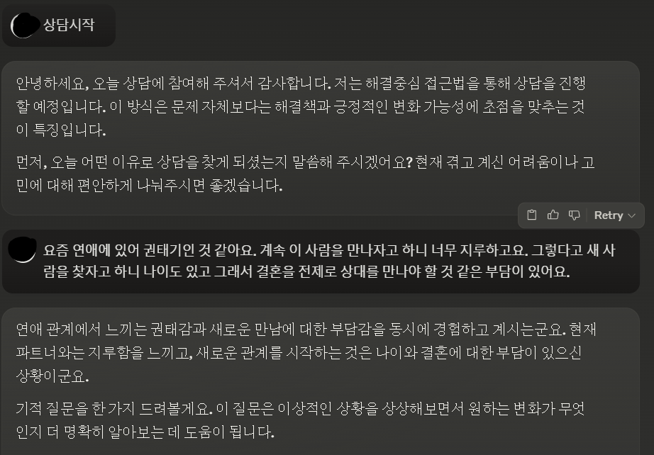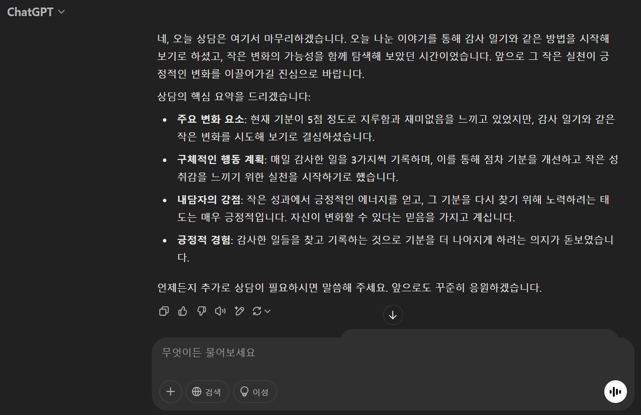 실제로 전부 제 이야기는 아니고, 진실 반, 거짓 반 섞어서 진행을 해보았는데요. 어떤가요? AI 상담가한테 찾아가 보고 싶어 지셨나요? 사람만 못한가요? 아니면 사람보다 나은가요? 무의미한 질문이겠지요. 왜냐하면 SFBT에 따르면 뭐든 내담자에게 가장 도움이 되는 전략으로 문제를 해결하는 것이 가장 중요하기 때문입니다. 이 글에서 궁금한 점이나 개선할 점이 있다면, 댓글로 소통할 수 있을 것 같아요. 여러분이 자유롭게 이 Prompt들을 사용하신다면 저는 정말 기쁠 것 같습니다.