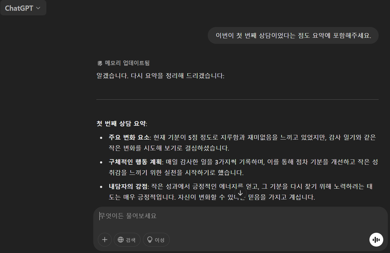 먼저, Prompt 전문과 함께 첫 번째 상담 요약본을 함께 시작부에 제공했습니다. 이렇게요.